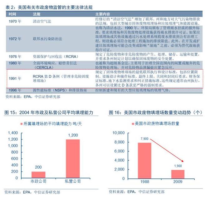上世紀(jì)90年代,美國市政廢物填埋場曾經(jīng)爆發(fā)大氣、土壤、水源污染一系列環(huán)境污染問題,導(dǎo)致居民對于社區(qū)周邊建設(shè)和運營垃圾填埋場的反對聲音日益高漲。針對上述環(huán)境問題,1991年,專門用于監(jiān)管非危廢填埋場的《資源保護與回収法》D條例頒布,大幅提升了市政廢物填埋場的設(shè)計、運營及環(huán)保等標(biāo)準(zhǔn)。受此影響,大量靠近社區(qū)或運營不達標(biāo)的填埋場在上世紀(jì)90年代被迫關(guān)停,且填埋場的建設(shè)和運營成本上升明顯。根據(jù)EPA的統(tǒng)計,美國市政廢物填埋市場數(shù)量自1988年的7,900座下滑約75%至2009年的1,900座,填埋場數(shù)量降幅明顯。