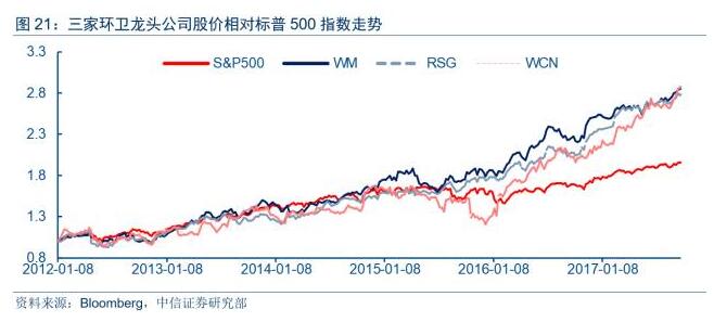 高股息率、不依賴外部融資和突出的定價能力對投資具有較強吸引力。從公司股價相對標(biāo)普指數(shù)走勢看,三家環(huán)衛(wèi)龍頭股價均顯跑贏標(biāo)普500指數(shù),具有較明顯的相對收益。