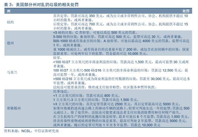 目前在美國,道路清掃業(yè)務(wù)市場規(guī)模相比清運和清理而言幾乎可以忽略不計,主要原因是美國道路清掃需求較低,這和國內(nèi)環(huán)衛(wèi)市場以清掃為主的現(xiàn)狀存在顯著差異。美國亂扔垃圾是一種犯罪行為,50個州均制定禁止亂扔垃圾的法律,罰款范圍從科羅拉多州的20美元到馬里蘭州的30,000美元,且在更嚴(yán)重情況下會處以監(jiān)禁,比如說在愛達荷州的刑期為10天,在田納西州高達6年。對亂扔垃圾嚴(yán)格立法導(dǎo)致美國道路較為整潔,大多數(shù)城市的道路清掃頻率為每周一次,部分城市甚至每個月做一次道路清掃,道路清掃的需求非常低,相應(yīng)導(dǎo)致清掃業(yè)務(wù)市場規(guī)模比較小。