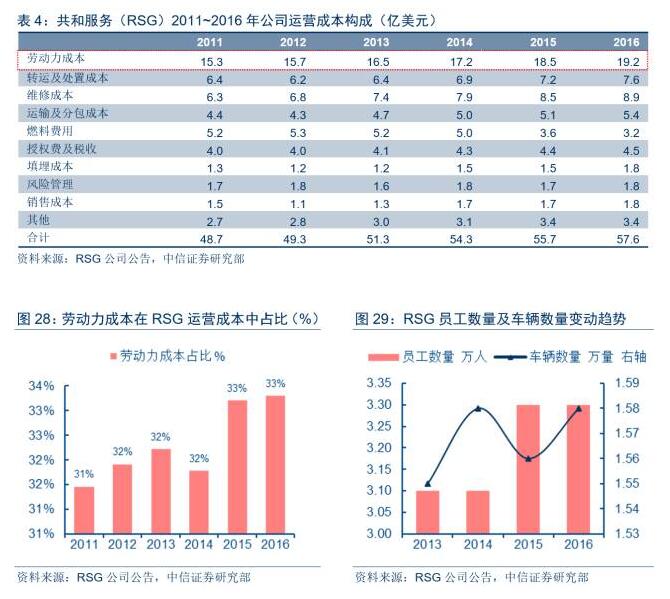 美國生活垃圾的清掃與收集基本實現(xiàn)完全機械化,由居民先行實施垃圾分類處理,環(huán)衛(wèi)工人直接通過駕駛特制裝載車收集社區(qū)住戶附近垃圾桶內(nèi)的廢棄物,然后將市政廢物運往垃圾轉(zhuǎn)運中心或者最終處理設(shè)施。以共和服務(wù)(RSG)為例,從員工數(shù)量和公司機械設(shè)備數(shù)量看,RSG的員工數(shù)量和車輛數(shù)量大體維持在2:1的水平;在2011~2016年公司運營成本構(gòu)成中,勞動力成本在公司運營成本占比穩(wěn)定維持在31%~33%的區(qū)間內(nèi),顯著低于國內(nèi)環(huán)衛(wèi)市場中的勞動力成本占比。由此可見,通過持續(xù)不斷的機械化替代,廢物管理市場各參與方的勞動力成本規(guī)模和占比確實可以實現(xiàn)有效控制。