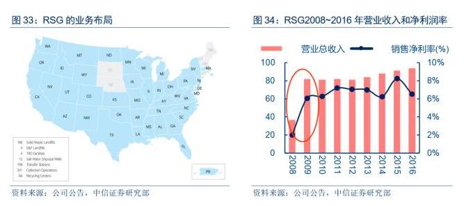 1981年,公司前身RepublicIndustry作為垃圾處理公司成立;1998年,RepublicIndustry將共和國服務(wù)公司(RSG)分拆上市;2008年6月,RSG以61億美元的股票收購其較大的競爭對手AlliedWasteIndustries,一舉成為美國第二大廢物管理公司。大體量并購?fù)苿庸緺I業(yè)收入從2008年的36.85億美元上升到2009年的81.99億美元,同比上升122.49%;凈利潤從2008年的0.74億美元上升到2009年的4.95億美元,同比上升570.73%。
