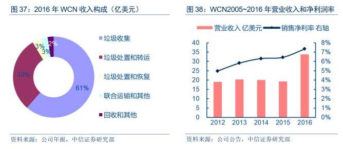 從收入規(guī)??矗瑥U物聯(lián)合公司(WCN)是北美第三大固體廢物服務(wù)公司,也是北美領(lǐng)先的油田廢物處理公司,在美國和加拿大提供垃圾收集、轉(zhuǎn)運、處置和回收服務(wù)。截至2016年末,公司經(jīng)營261個固體廢物收集操作網(wǎng)絡(luò),135個轉(zhuǎn)運站,7個聯(lián)運設(shè)施,71個回收中心,93個垃圾填埋場,22個E&P液體廢物注入井和17個E&P廢物處理和采油設(shè)施??蛻艉w美國40個州和加拿大5個省份的住宅、商業(yè)、工業(yè)和E&P客戶。2016年公司實現(xiàn)營業(yè)收入33.76億美元,凈利潤2.47億美元。