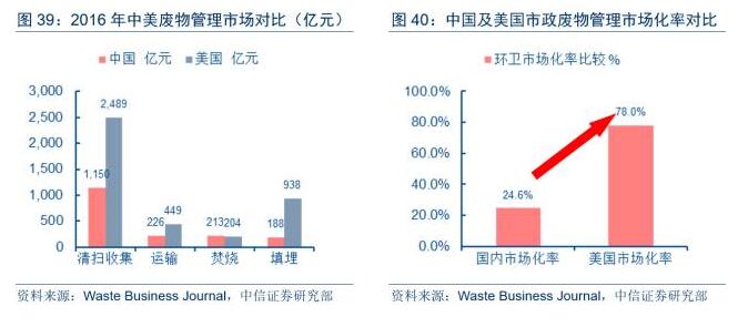 從市場規(guī)模和市場化程度的國際比較看,國內(nèi)環(huán)衛(wèi)市場擴容潛力充分,2016年的美國市政廢物管理市場規(guī)模高達4,080億元(600億美元),是同期國內(nèi)市場規(guī)模的近3倍。對于從事環(huán)衛(wèi)業(yè)務(wù)的公司而言,除享受行業(yè)整體高單位數(shù)增長的成長擴容潛力外,更大的成長紅利在于市場化加速推進帶來的訂單轉(zhuǎn)移。從市場化程度看,目前美國市政廢物管理市場的市場化率為78.0%,私營企業(yè)在市場影響力和占有率等方面中擁有支配地位;而根據(jù)我們的測算,目前我國市政廢物管理市場(環(huán)衛(wèi)+最終處置)的市場化率僅為24.6%,其中我們估計環(huán)衛(wèi)的市場化率約為20%,和美國市場差距甚遠?;诖耍袌龌什町愄N含龐大的市場化加速推進帶來的訂單轉(zhuǎn)移釋放機遇。