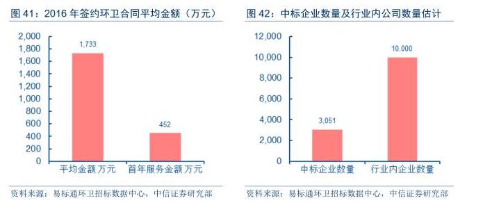 目前國內(nèi)環(huán)衛(wèi)市場參與企業(yè)數(shù)量多,合同規(guī)模小,環(huán)衛(wèi)市場高度分散。根據(jù)易標(biāo)通環(huán)衛(wèi)招標(biāo)數(shù)據(jù)中心發(fā)布的《2016年全國環(huán)衛(wèi)服務(wù)環(huán)衛(wèi)招標(biāo)市場年報》,目前全國相對活躍的環(huán)衛(wèi)企業(yè)約有10,000家左右。2016年,全國共有3,234家企業(yè)中標(biāo)環(huán)衛(wèi)項目,全國各地共發(fā)布環(huán)衛(wèi)招標(biāo)項目5,497個,按照中標(biāo)企業(yè)數(shù)量計算,平均每家企業(yè)中標(biāo)項目數(shù)量為1.7個。此外,從合同規(guī)??矗?016年,全國各地新簽環(huán)衛(wèi)服務(wù)合同總金額為861億元,平均每個項目的合同金額為1,733萬元;新簽項目的首年服務(wù)總金額為224億元,平均每個項目的首年服務(wù)金額為452萬元,項目規(guī)模明顯偏小。
