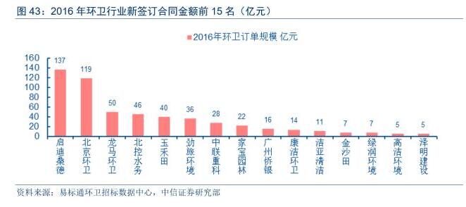 盡管參與企業(yè)眾多,但隨著資本快速進入,龍頭企業(yè)開始快速跑馬圈地,環(huán)衛(wèi)市場訂單逐步在向具有資金&資源&管理的優(yōu)勢企業(yè)集中。根據(jù)易標(biāo)通環(huán)衛(wèi)招標(biāo)數(shù)據(jù)中心統(tǒng)計數(shù)據(jù),按照合同規(guī)模排名,2016年國內(nèi)環(huán)衛(wèi)市場簽約規(guī)模前5名企業(yè)為啟迪桑德、北京環(huán)衛(wèi)、龍馬環(huán)衛(wèi)、北控水務(wù)、玉禾田等,簽約合同規(guī)模分別為137、119、50、46、40億元。2016年前15名企業(yè)的合同簽約規(guī)模合計為542億元,占全國新簽環(huán)衛(wèi)服務(wù)合同總規(guī)模的62.9%。