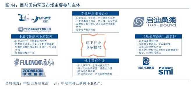 區(qū)域性國企公司:政府資源密切,主要依托當(dāng)?shù)卣P(guān)系開展業(yè)務(wù),在當(dāng)?shù)丨h(huán)衛(wèi)市場中占據(jù)主導(dǎo)地位,但市場化程度、管理效率和跨區(qū)域運營能力等方面能力偏弱。不過,部分在機制及活力等方面表現(xiàn)突出的區(qū)域性國企未來進一步成長潛力也比較充沛,以北京市國資委下屬的北京環(huán)衛(wèi)等為典型代表。