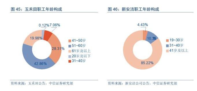 目前國內(nèi)環(huán)衛(wèi)行業(yè)的勞動力密度程度高且勞動力老齡化問題突出。環(huán)衛(wèi)服務(wù)業(yè)很多從業(yè)人員已經(jīng)超過退休年齡。從玉禾田和新安潔兩家環(huán)衛(wèi)公司職工年齡統(tǒng)計可以看到,40歲以上員工占大部分,其中51歲以上比例也不小。如果只對環(huán)衛(wèi)一線員工進行統(tǒng)計,老齡員工占比會進一步提升。向前看,老齡化未來會隨著人口紅利的喪失會變得更加突出。
