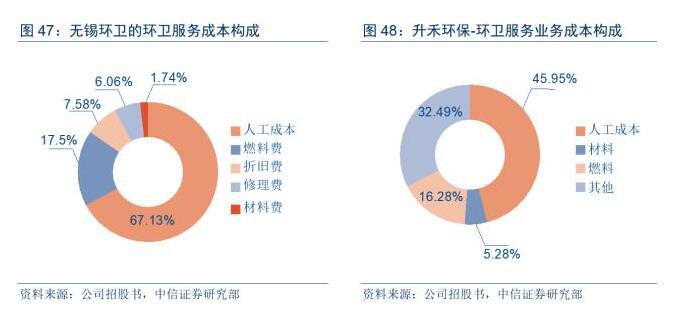 從成本構(gòu)成看,環(huán)衛(wèi)服務(wù)項目成本主要由環(huán)衛(wèi)職工薪酬、保險等人工成本、環(huán)衛(wèi)車輛等環(huán)衛(wèi)設(shè)備燃料成本、設(shè)備折舊、設(shè)備維修費等部分組成,勞動力高度密集導(dǎo)致人工成本占比最大,目前普遍占到環(huán)衛(wèi)運營成本的60%~70%。