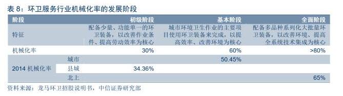 從國內(nèi)機械化率變動趨勢看,近年來持續(xù)處于快速提升趨勢中,其中城市機械化清掃率從2013年的44%提升至2016年的60%,縣城機械化清掃率從2013年的32%提升至2016年的51%,2013~2016年平均分別提升5個及6個百分點。參考海外環(huán)衛(wèi)全部機械化作業(yè)的發(fā)展經(jīng)驗,國內(nèi)機械化率提升仍有較大提升空間。