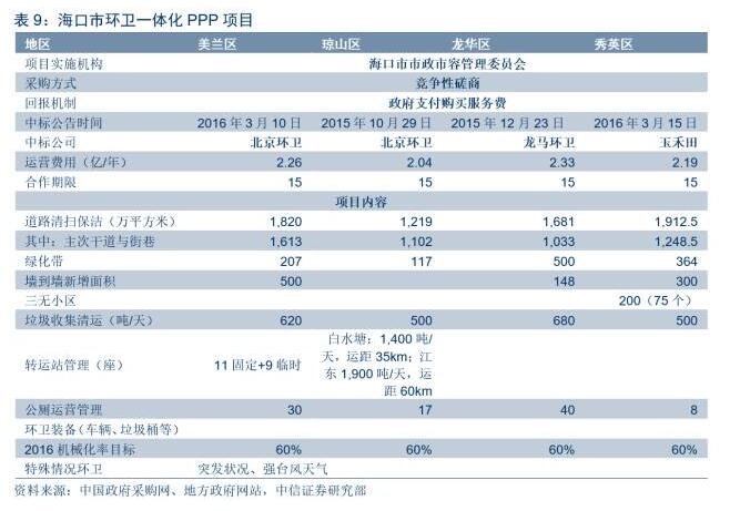 在國家及地方一系列環(huán)衛(wèi)市場化政策推動下,環(huán)衛(wèi)服務(wù)業(yè)市場化項目規(guī)模迅速擴大。目前已有許多以PPP模式運營的環(huán)衛(wèi)項目完成招標(biāo)。在招標(biāo)時,一種模式為環(huán)衛(wèi)一體化的整體處理項目,包含道路清掃、垃圾清運、公廁維護等分項的項目;除上述模式外,將環(huán)衛(wèi)與后端垃圾焚燒發(fā)電、餐廚及污泥處置等項目綜合打包也開始變得頻繁起來。其中??诃h(huán)衛(wèi)一體化PPP項目以及固原市循環(huán)經(jīng)濟產(chǎn)業(yè)園及環(huán)衛(wèi)一體化項目分別為上述模式的典型案例。