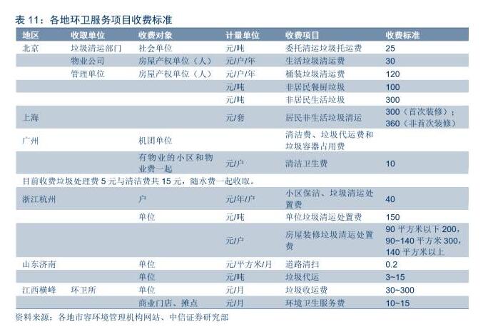 而對于垃圾清運項目,部分地區(qū)沒有對此項進行相關(guān)收費規(guī)定,而僅針對從市政垃圾轉(zhuǎn)運站到后續(xù)處理的過程收取垃圾處理費。根據(jù)收費對象不同以及是否為生活垃圾,收費標(biāo)準(zhǔn)也有所不同。以北京市為例,其收取生活垃圾清運費標(biāo)準(zhǔn)為30元/戶/年,遠遠低于垃圾清運75元/噸的市場價格,多余部分主要靠財政補貼為主;而且垃圾清運費的收取存在難度,廣州因為多戶欠繳費用,考慮試行隨水費一起征收的辦法來提高繳費居民比例,差額部分仍需政府財政投入來保證環(huán)衛(wèi)服務(wù)項目正常運轉(zhuǎn)。