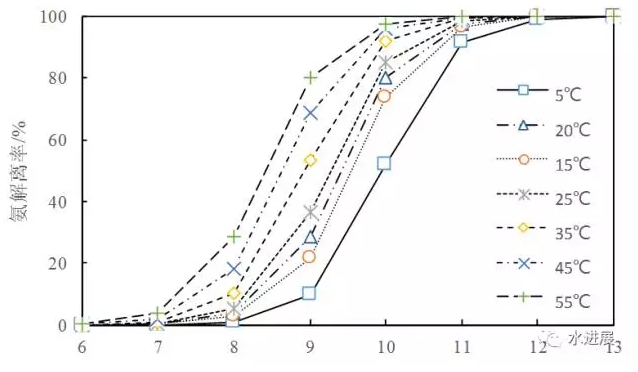 根據(jù)計算(過程見原文,此處省),當pH≥11、液體溫度雖為5 ℃時,氨解離率達92%;但當pH=7時,即使溫度上升至55 ℃,其解離率也僅為3.9%。所以,pH對氨氮吹效率影響最大,次要影響因素還有溫度、氣水比、氨氮濃度等。