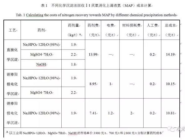 采用鳥糞石結晶方式回收氮受環(huán)境影響因素較大,pH、NH4+濃度、溫度以及陽離子競爭(如Ca2+與Mg2+競爭)等。我們前期研究表明,獲得較純鳥糞石的pH并非大多文獻述及的堿性條件,而是中性、甚至偏酸性(pH£7.5)環(huán)境[20]。中性以下的pH固然可以獲得較為純凈的鳥糞石,但所需反應時間甚長,需要以催化方式(如,電化學沉積法[20])加速反應,這勢必增加回收技術的復雜程度。事實上,鳥糞石回收主要針對磷的回收,氮只不過是順帶“夾裹”而已。即使是針對鳥糞石回收磷,如果采用電化學沉積這樣的結晶法,其生產成本也是極高的。以回收鳥糞石為目的,處理并100%回收1 t NH4+濃度為106.1 mg N/L、PO43-濃度為37. 2 mg P/L厭氧消化上清液,不同工藝反應、回收成本計算見表1;折算后直接化學沉淀法成本約為163元/kg N,碳棒陽極電化學沉淀為117元/kg N,鎂棒陽極電化學沉淀為124元/kg N。