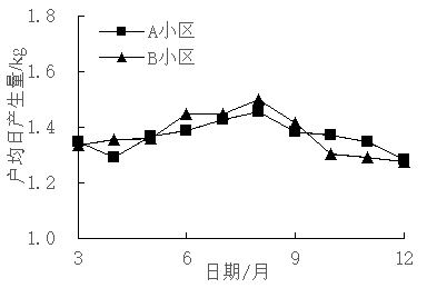 居民家庭的生活垃圾產(chǎn)生量與日常生活習(xí)慣和消費(fèi)支出有關(guān),試點(diǎn)小區(qū)居民戶均日產(chǎn)生量如圖4所示。試點(diǎn)小區(qū)10個月內(nèi)共收集生活垃圾177 t,戶均日產(chǎn)生量為1.37 kg,6~9月生活垃圾產(chǎn)生率較高。統(tǒng)計數(shù)據(jù)顯示,周末和節(jié)假日的居民區(qū)生活垃圾產(chǎn)生量比工作日高20%以上,生活垃圾產(chǎn)生率與在家停留時間成正相關(guān)性。
