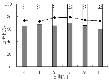 生活垃圾的三組分包括水分、可燃分和灰分(圖6),廚余垃圾平均含水率為75.24%,生活垃圾平均含水率為65.34%,且5~9月含水率最高。夏季水分含量較高的果蔬類廢棄物所占比例明顯高于其他季節(jié),導(dǎo)致廚余垃圾比例升高,含水率隨之升高。利用軟件IBM SPSS statistics 20對生活垃圾含水率和廚余垃圾含水率數(shù)據(jù)分別進(jìn)行W檢驗(yàn),在顯著性水平α=0.05條件下均滿足正態(tài)分布。二者Pearson相關(guān)系數(shù)為0.726,在0.01水平(雙側(cè))顯著相關(guān),降低生活垃圾含水率的關(guān)鍵在于降低廚余垃圾含水率。