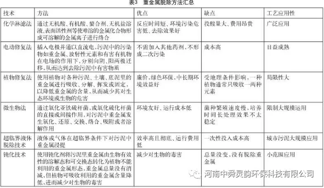 該法工業(yè)應(yīng)用成本低、可操作性強,短期效果明顯,國內(nèi)普遍使用此技術(shù)。但這種方法本身并不能降低污泥中重排和農(nóng)用,外界物理化學(xué)條件的改變,可能使重金屬再次分解和釋放,造成再次污染。因此需要對固化的污泥土壤進行長期跟蹤觀測。脫除重金屬技術(shù)就是將污泥和土壤中的重金屬去除掉,從根本上降低污染的風(fēng)險源。目前常見的方法有化學(xué)淋洗法、電化學(xué)修復(fù)法、熱化學(xué)轉(zhuǎn)化法、生物修復(fù)法、生物淋濾法、吸附法等(見表3)。