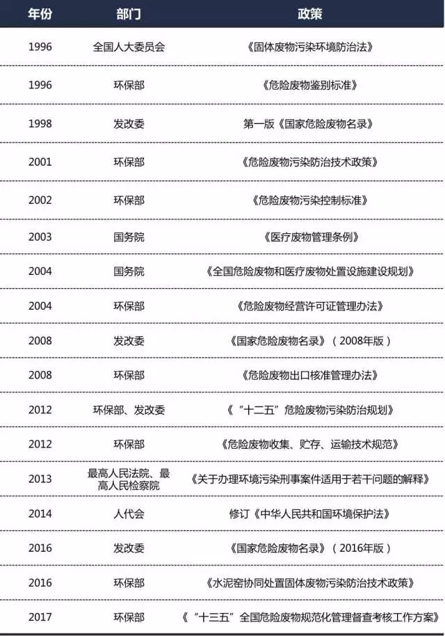 危廢政策不斷出臺,尤其是省級細(xì)則落地:1)2017年環(huán)保部出臺“十三五”全國危險廢物規(guī)范化管理督查考核工作方案,各省近期均推出省級危廢規(guī)范化管理督查方案;2)《國家危險廢物名錄》自2016年8月1日起施行;新修訂的《固體廢物污染環(huán)境防治法》取消危險廢物省內(nèi)轉(zhuǎn)移審批手續(xù);3)2016年最高司法機(jī)關(guān)就環(huán)境污染犯罪出臺專門司法解釋;4)2018年起實施《環(huán)境保護(hù)稅法》,危廢稅額1000元/噸;5)環(huán)保部發(fā)布《水泥窯協(xié)同處置固體廢物污染防治技術(shù)政策》,支持水泥窯協(xié)同處置。