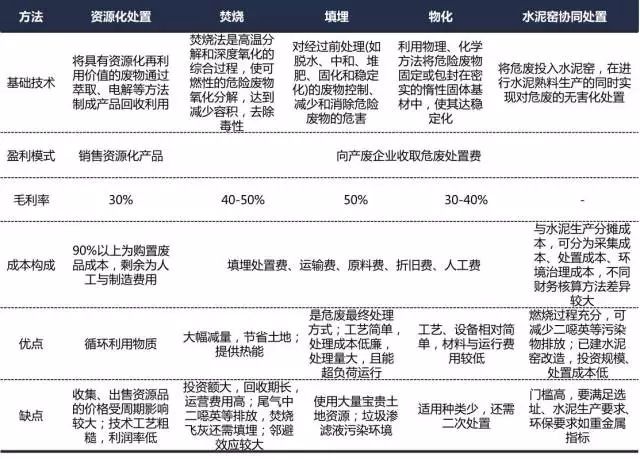 我國危廢處理方式基本以無害化處理及資源化利用為主。資源化利用的模式為危廢資源化企業(yè)向上游產(chǎn)廢企業(yè)收取有利用價值的廢物,再提純生產(chǎn)為資源化產(chǎn)品,收入來自于銷售產(chǎn)品,盈利受上游廢物價格及下游金屬價格影響。無害化處置是處置企業(yè)向產(chǎn)廢企業(yè)收取費用,主要包括焚燒、填埋、物化,水泥窯協(xié)同處置也可列為無害化處置的方法。無害化毛利較高,焚燒毛利可達(dá)40%以上,填埋毛利50%以上。水泥窯協(xié)同處置與水泥生產(chǎn)共攤成本,邊際成本較低。