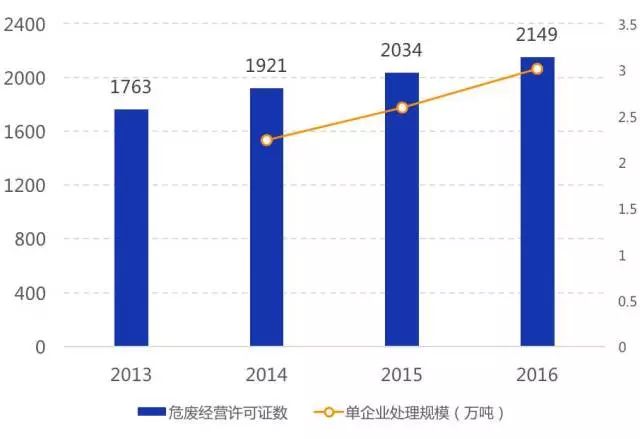 資質(zhì)企業(yè)平均規(guī)模較?。?016年我國持危險廢棄物經(jīng)營許可證的企業(yè)數(shù)量為2149家,2016年凈增加僅115家,體現(xiàn)出環(huán)保系統(tǒng)對新頒發(fā)許可證愈發(fā)謹(jǐn)慎;平均每家處理量僅不到3萬噸,呈現(xiàn)較強(qiáng)的分散性特征,但單企業(yè)處理規(guī)模由2014年2.2萬噸/年增加到2016年3.0萬噸/年,未來隨著許可證頒發(fā)與復(fù)核難度加大,實力弱、技術(shù)差的小企業(yè)將被淘汰出市場,龍頭擴(kuò)張,單企業(yè)規(guī)模繼續(xù)擴(kuò)大。