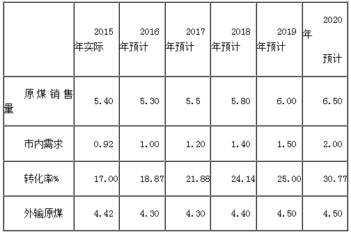 “十二五”期間,全市每年商品煤調(diào)出區(qū)外保持在4-5億噸左右。預測“十三五”期間,東部地區(qū)開采量逐步減少,促使全國煤炭生產(chǎn)量逐步降低。同時受經(jīng)濟形勢以及環(huán)境政策的變化,煤炭消費占能源消費的比重也會逐步下降。因此“十三五”期間,鄂爾多斯市外銷煤炭趨于穩(wěn)定,每年外調(diào)原煤在4.5億噸左右。見表2—2
