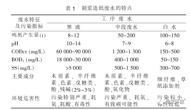 造紙廢水產(chǎn)生與生產(chǎn)過(guò)程的各個(gè)工序有關(guān),總的來(lái)說(shuō)可以分為黑液、中段廢水與白水三類,其成分、產(chǎn)生量及水質(zhì)特征列于表1