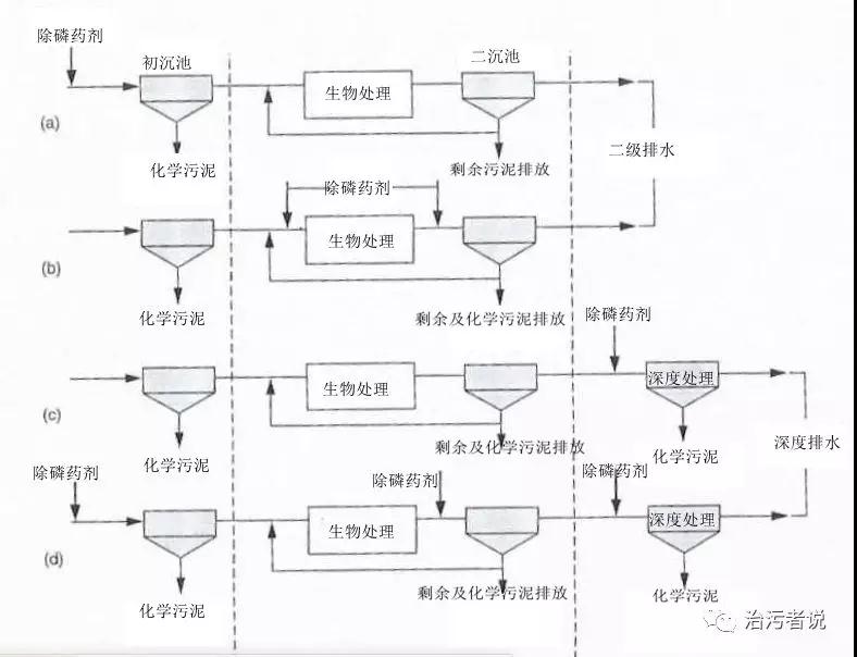 在了解了這三種藥劑的化學(xué)反應(yīng)機理以后,我們需要了解化學(xué)藥劑在污水廠的投加點。污水處理廠從生物處理階段來說,一般分為一級物理處理,二級生物處理,三級深度處理。而化學(xué)藥劑的投加點也就分別在這三處,根據(jù)與生物處理的位置不同,分為前投加,同步投加,后投加,全投加四種,對應(yīng)于下圖中的a、b、c、d四種模式。