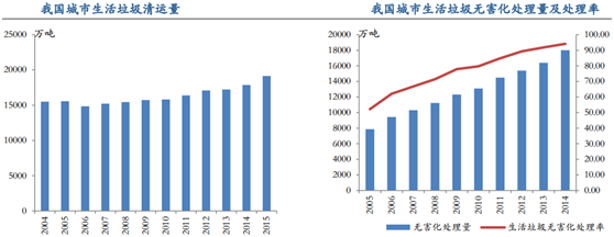 智通財(cái)經(jīng)APP了解到,2015年全國(guó)城市生活垃圾清運(yùn)量為1.92億噸,過去十年的年均復(fù)合增長(zhǎng)率為2.11%;其中城市生活垃圾的無害化處理率由2005年的52%提高至2015年的94%,復(fù)合增長(zhǎng)率達(dá)到8.38%。但是市轄區(qū)農(nóng)村部分的無害化處理率僅為62.02%,且人均生活垃圾清運(yùn)量已經(jīng)達(dá)到1.12千克,處于較高水平,垃圾處理的需求仍有較大空間。