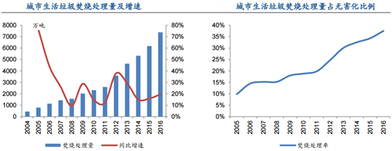 從近十年的發(fā)展態(tài)勢(shì)來看,國(guó)內(nèi)垃圾焚燒處理增長(zhǎng)迅猛,從2005年的791萬噸增長(zhǎng)至2015年的6175萬噸,年均復(fù)合增長(zhǎng)率達(dá)到22.81%以上,焚燒率也由2005年的9.83%增長(zhǎng)至2015年的34.28%,因此焚燒法將成為未來主流的垃圾處理方式。