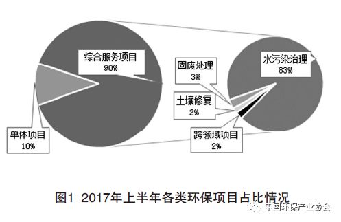 2017年上半年(截至2017年6月30日的數(shù)據(jù),下同),環(huán)境綜合治理項(xiàng)目出現(xiàn)爆發(fā)式增長,樣本上市公 司披露各類中標(biāo)、簽約項(xiàng)目92項(xiàng),占上半年披露項(xiàng)目總數(shù)的51%,投資總額約1470億元,占上半年披露項(xiàng)目投資總額的89.5%,成為推動(dòng)環(huán)保市場增長的主要因素。其中,受“河長制度”( 2016年12月,中中央辦公廳、國務(wù)院辦公廳印發(fā)《關(guān)于全面推行河長制的意見》,要求2018年底前全面建立河長制,實(shí)現(xiàn)省、市、縣、鄉(xiāng)四級主要領(lǐng)導(dǎo)對水環(huán)境質(zhì)量直接負(fù)責(zé))和PPP(政府與社會 資本合作模式)政策的雙重推動(dòng),水環(huán)境綜合治理項(xiàng)目增長最多,項(xiàng)目總投資約1365億元;固廢綜合治理項(xiàng)目總投資約43億元;土壤污染綜合治理項(xiàng)目26億元。2017年上半年各類環(huán)保項(xiàng)目占比情況如圖1。