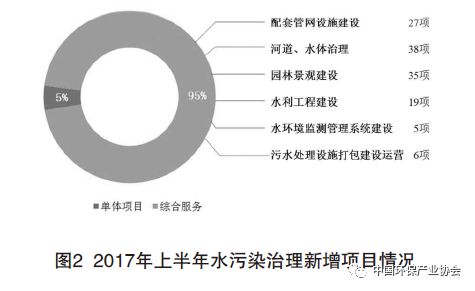 從2017年上半年的環(huán)保上市公司披露項(xiàng)目來看,114個(gè)水污染治理項(xiàng)目中,36個(gè)單體項(xiàng)目,投資總額 65億元;78個(gè)綜合治理項(xiàng)目投資總額達(dá)1364億元。其中,包含配套管網(wǎng)設(shè)施建設(shè)內(nèi)容的項(xiàng)目27個(gè);包含河道水體治理內(nèi)容(指河道清淤、黑臭水體治理等內(nèi)容)的項(xiàng)目38個(gè);包含園林景觀建設(shè)內(nèi)容的項(xiàng)目35個(gè);包含水利工程建設(shè)內(nèi)容的項(xiàng)目19個(gè);包含水環(huán)境監(jiān)測、管理系統(tǒng)建設(shè)內(nèi)容的項(xiàng)目5個(gè)。以北控水務(wù)同中建一局聯(lián)合中標(biāo)的包頭市城市水生態(tài)提升綜合利用PPP項(xiàng)目為例,該項(xiàng)目集全城域的水利防洪工程、水資源調(diào)配工程、河湖水網(wǎng)連通工程、城市景觀水系工程以及智慧水務(wù)管理工程為一體,估算靜態(tài)總投資達(dá)196億元。2017年上半年水污染治理新增項(xiàng)目情況如圖2。