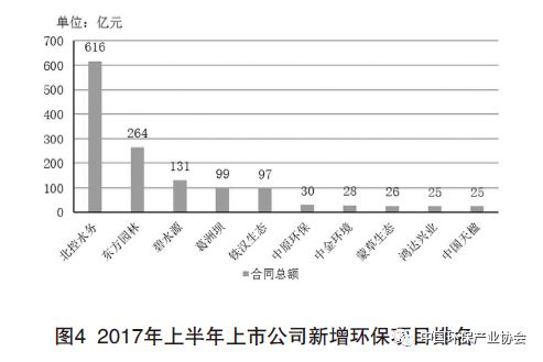 在政策和資本推動(dòng)下,環(huán)保產(chǎn)業(yè)迅猛發(fā)展,環(huán)保企業(yè)規(guī)模逐漸壯大,拿單能力不斷提升。根據(jù)咨詢公司從公開渠道的資料統(tǒng)計(jì),上半年上市公司披露的環(huán)保項(xiàng)目中,北控水務(wù)簽約中標(biāo)環(huán)保項(xiàng)目15個(gè),投資總額616億元(聯(lián)合體項(xiàng)目由于內(nèi)部投資額分配情況不明,因此按牽頭人統(tǒng)計(jì),例如去年中標(biāo)今年簽約的4個(gè)北京市通州區(qū)水環(huán)境治理項(xiàng)目總投資280億元,北控水務(wù)為牽頭人,則全部計(jì)入北控水務(wù)投資),其次,東方園林、碧水源等公司也獲得超過百億元的新增項(xiàng)目,拿單能力分化趨勢凸顯。2017年上半年上市公司新增環(huán)保項(xiàng)目排名見圖4。