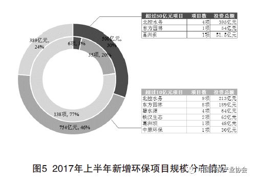 在環(huán)境治理市場向綜合服務(wù)升級的趨勢下對環(huán)保企業(yè)的資金、技術(shù)、資源調(diào)配能力要求越來越高,環(huán)保企業(yè)之間的拿單能力開始分化。上半年大型綜合治理項(xiàng)目主要集中在北控水務(wù)、東方園林、碧水源、國禎環(huán)保等少數(shù)幾個(gè)環(huán)保企業(yè)手中。6個(gè)超過50億元的項(xiàng)目,分別來自北控水務(wù)(4項(xiàng))、東方園林(1項(xiàng))、葛洲壩(1 項(xiàng))。項(xiàng)目投資額在10億~50億元之間的35個(gè)項(xiàng)目中, 北控水務(wù)、東方園林、碧水源獲得21項(xiàng)。2017年上半年新增環(huán)保項(xiàng)目規(guī)模分布情況如圖5。