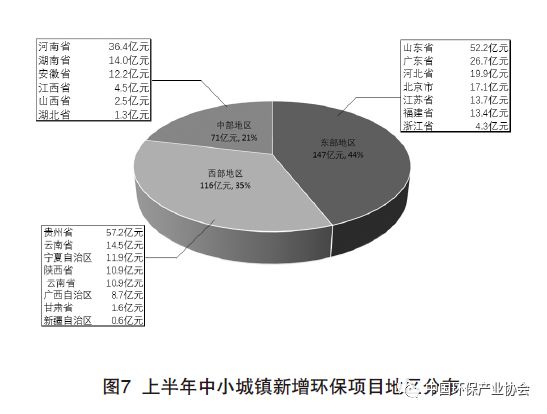 從地域分布來看,貴州、山東、河南、廣東等省市中小城鎮(zhèn)環(huán)保項(xiàng)目總投資額較大??傮w來看,東部地區(qū) 中小城鎮(zhèn)環(huán)保市場活躍,投資額占比超過44.1%,中部地區(qū)占比21.2%,西部地區(qū)占比34.8%。2017年上半年中小城鎮(zhèn)新增環(huán)保項(xiàng)目地區(qū)分布見圖7。