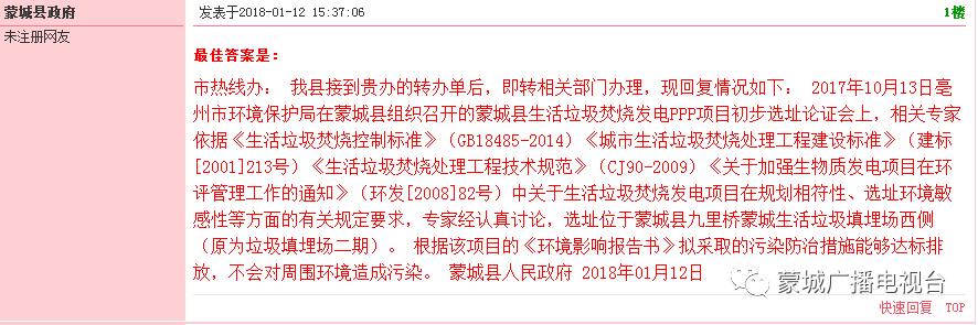 市熱線辦: 我縣接到貴辦的轉(zhuǎn)辦單后,即轉(zhuǎn)相關(guān)部門辦理,現(xiàn)回復(fù)情況如下: 2017年10月13日亳州市環(huán)境保護(hù)局在蒙城縣組織召開的蒙城縣生活垃圾焚燒發(fā)電PPP項(xiàng)目初步選址論證會(huì)上,相關(guān)專家依據(jù)《生活垃圾焚燒控制標(biāo)準(zhǔn)》(GB18485-2014)《城市生活垃圾焚燒處理工程建設(shè)標(biāo)準(zhǔn)》(建標(biāo)[2001]213號(hào))《生活垃圾焚燒處理工程技術(shù)規(guī)范》(CJ90-2009)《關(guān)于加強(qiáng)生物質(zhì)發(fā)電項(xiàng)目在環(huán)評(píng)管理工作的通知》(環(huán)發(fā)[2008]82號(hào))中關(guān)于生活垃圾焚燒發(fā)電項(xiàng)目在規(guī)劃相符性、選址環(huán)境敏感性等方面的有關(guān)規(guī)定要求,專家經(jīng)認(rèn)真討論,選址位于蒙城縣九里橋蒙城生活垃圾填埋場(chǎng)西側(cè)(原為垃圾填埋場(chǎng)二期)。