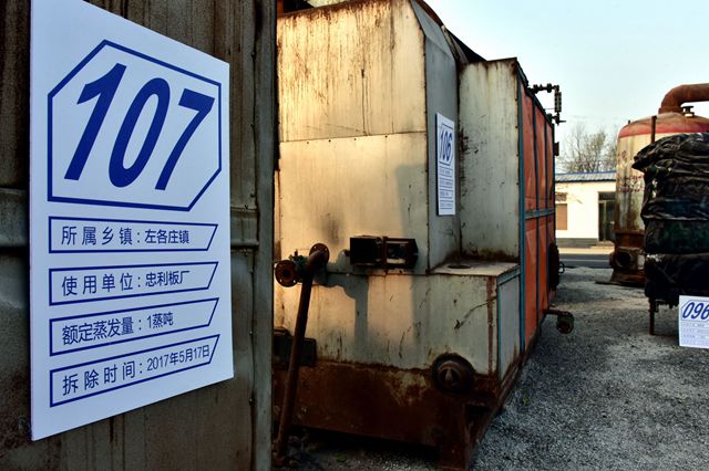 2017年11月22日, 在環(huán)保部召開的京津冀“散亂污”企業(yè)整治現(xiàn)場會上,文安縣的拆除燃煤鍋爐集中存放現(xiàn)場。攝影/章軻