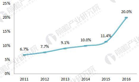 圖表3:2011-2016年中國對生活污水進行處理的行政村比例(單位:%)