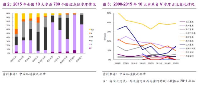 我國(guó)河流污染情況依舊嚴(yán)重,整體雖有所好轉(zhuǎn),但2011-2015年期間改善不明顯。根據(jù)2015年中國(guó)環(huán)境狀況公告顯示,長(zhǎng)江、黃河、珠江、松花江、淮河、海河、遼河等七大流域和浙閩片河流、西北諸河、西南諸河的700個(gè)國(guó)控點(diǎn)位中;IV類(lèi)占14.3%,V類(lèi)占4.7%,劣V類(lèi)占8.9%且主要集中在海河、淮河、遼河和黃河流域。海河監(jiān)控點(diǎn)位水質(zhì)劣V類(lèi)達(dá)到39.1%,其中支流劣V占比更是高達(dá)44.0%。
