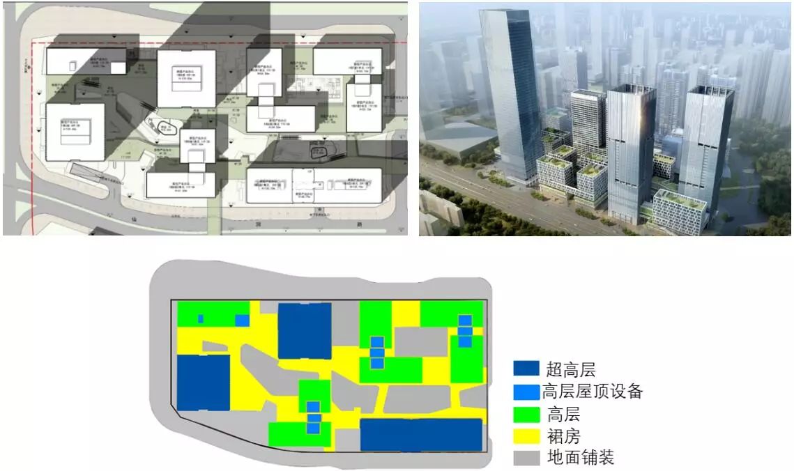 對現(xiàn)有建筑方案的受雨面進行分析可知:裙房屋頂綠化比例21%、高層塔樓屋頂綠化比例49%、超高層屋頂不做綠化、首層地面鋪裝及綠化不做處理。