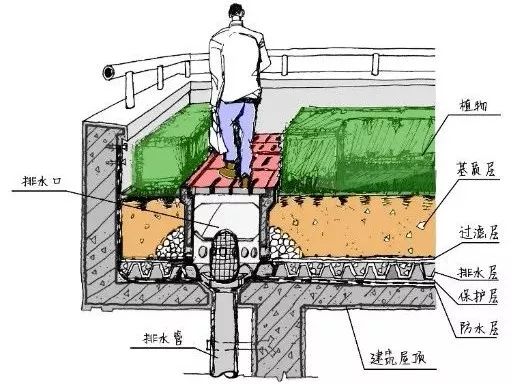 高密度開發(fā)區(qū)往往設(shè)計有裙樓及聯(lián)通塔樓之間的連廊,此處宜采用綠色屋頂形式來減少屋面徑流總量和徑流污染負荷,綠色屋頂又分為簡單式和花園式,基質(zhì)深度根據(jù)植物需求及屋頂荷載確定,簡單式綠色屋頂?shù)幕|(zhì)深度一般不大于150mm,花園式綠色屋頂在種植喬木時基質(zhì)深度可超過600mm,綠色屋頂?shù)脑O(shè)計可參考《種植屋面工程技術(shù)規(guī)程》(JGJ155)。