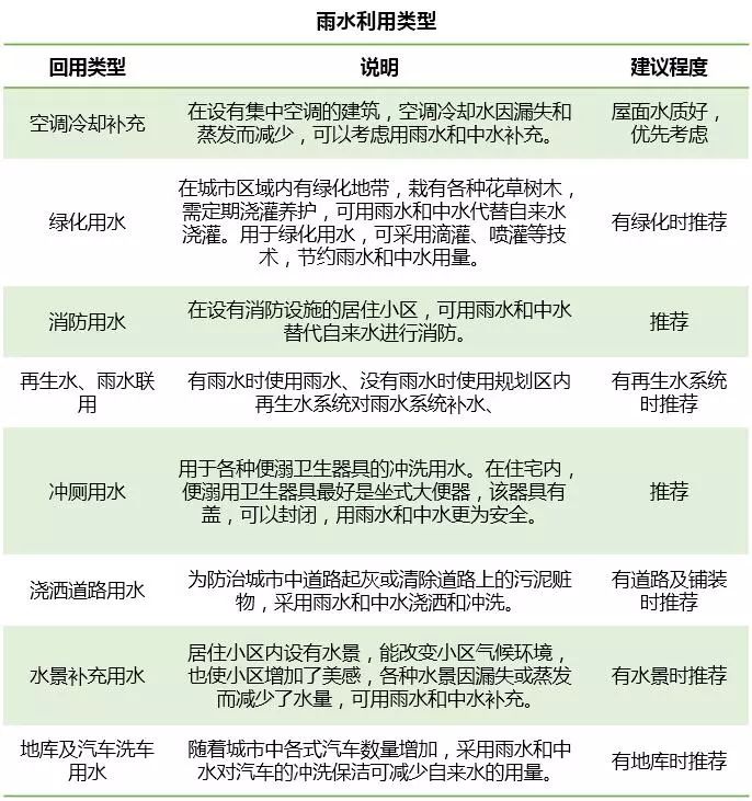 根據(jù)高密度開發(fā)地塊對雨水回用的需求,合理確定雨水回用(調(diào)蓄)池的容積,雨水回用池宜收集屋頂、綠地等較為潔凈雨水,經(jīng)過沉淀、消毒等工藝后進行回用。也可僅作為雨水調(diào)蓄削峰用途,在進行雨水收集及初期雨水棄流后,錯峰排出。高密度開發(fā)地塊水量需求大且雨水處理成本低(約0.1-0.2元/m3),宜優(yōu)先考慮空調(diào)冷卻補充及地庫及汽車洗車用水,可參考下表選用。