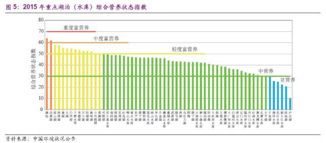 湖泊是重要的地表水資源,與人類的生活息息相關(guān),富營(yíng)養(yǎng)化不可忽視。2015年,開展?fàn)I養(yǎng)狀態(tài)監(jiān)測(cè)的61個(gè)湖泊(水庫)中,貧營(yíng)養(yǎng)的6個(gè);中營(yíng)養(yǎng)的41個(gè),輕度富營(yíng)養(yǎng)的12個(gè),中度富營(yíng)養(yǎng)的2個(gè)。