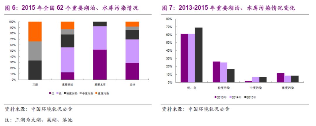 根據(jù)2015年中國(guó)環(huán)境狀況公告,“三湖”即太湖、巢湖、滇池均有不同程度的污染。重要湖泊(32個(gè)),污染比例逾30%,重點(diǎn)水庫水質(zhì)情況較好。而根據(jù)2013-2015年數(shù)據(jù)比較,污染情況改善依然不明顯。(注:優(yōu)為Ⅰ類和Ⅱ類水質(zhì),良好為Ⅲ類水質(zhì),輕度污染為Ⅳ類水質(zhì),中度污染為Ⅴ類水質(zhì),重度污染為劣Ⅴ類水質(zhì)。)