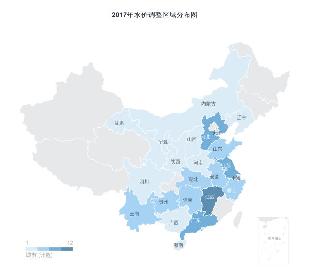 2017年發(fā)生水價調(diào)整的縣市共計87個,涉及24個省份。主要集中在中部地區(qū),其中江西省多達12個縣市發(fā)生水價調(diào)整。