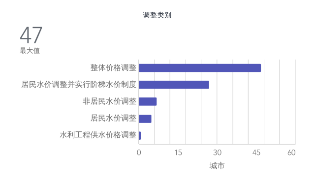 87個縣市中,有47個縣市對水價進行了整體調(diào)整,29個縣市調(diào)整了居民用水價并開始實施階梯水價制度,7個縣市對非居民用水價進行了調(diào)整。