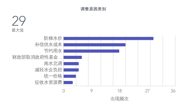 在調(diào)整水價的原因中,有29個縣市是為了執(zhí)行階梯水價而進行水價調(diào)整。另外補償供水成本,節(jié)約用水也是水價調(diào)整的主要原因。