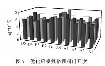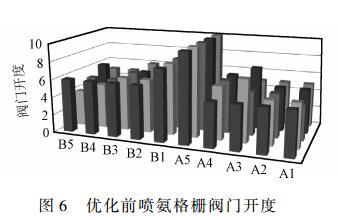調(diào)前、調(diào)后噴氨格柵閥門(mén)開(kāi)度分別見(jiàn)圖6、圖7。