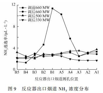 可知,機(jī)組調(diào)前在660MW負(fù)荷下,均值濃度分別為56、43.5mg?m-3,但不同測(cè)孔的NOx濃度差異較大,其中B側(cè)NOx濃度最大偏差為74.7mg?m-3、而A側(cè)為56.2mg?m-3。噴氨格柵優(yōu)化調(diào)整后,NOx均值濃度基本不變,而在660、500、330MW負(fù)荷下,NOx濃度差異性均明顯降低,B側(cè)最大偏差分別降至3.9、13.6、8.6mg?m-3,而A側(cè)對(duì)應(yīng)偏差分別為7.9、7.0、15.1mg?m-3。