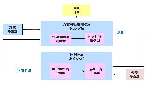 采用預(yù)測降雨量(約半小時之內(nèi)),結(jié)合水流、水質(zhì)簡化模型,管網(wǎng)優(yōu)化目標(biāo)以及物理約束等計算出一段采樣時間內(nèi)的最優(yōu)控制策略(主要針對水閥水泵)并賦給管網(wǎng)仿真系統(tǒng)或真實管網(wǎng)系統(tǒng),優(yōu)化控制軟件采用自主研發(fā)平臺MPCTool;