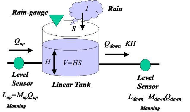 如圖3所示,Linear Tank代表集水區(qū),I 為降雨強(qiáng)度,S為集水區(qū)表面積,Lup,Ldown為上下游水位值,通過水位水流轉(zhuǎn)換系數(shù),可計算的上游、下游水流量Qup,Qdown,其中Lup,Ldown以及I降雨強(qiáng)度分別由水位傳感器和雨量計測量提供,是模型校驗的訓(xùn)練數(shù)據(jù)集 [2]。