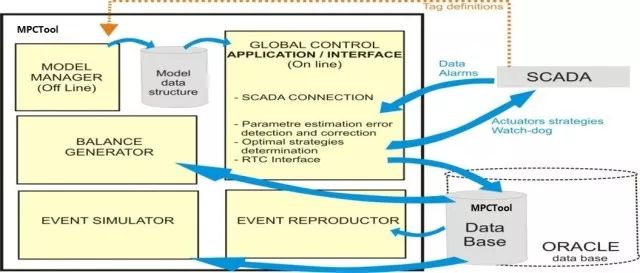 MPCTool是由西班牙科學(xué)院與加泰羅尼亞理工大學(xué)共同開發(fā)的城市排水系統(tǒng)集成在線控制平臺 (圖6)。MPCTool基于上述水流、水質(zhì)簡化模型和魯棒MPC控制方法,通過一定時間內(nèi)預(yù)測降雨優(yōu)化系統(tǒng)目標(biāo),并產(chǎn)生針對閥門水泵等可控部件的最優(yōu)策略來實現(xiàn)最小化城市內(nèi)澇、減少溢流及污染物泄露等現(xiàn)象。